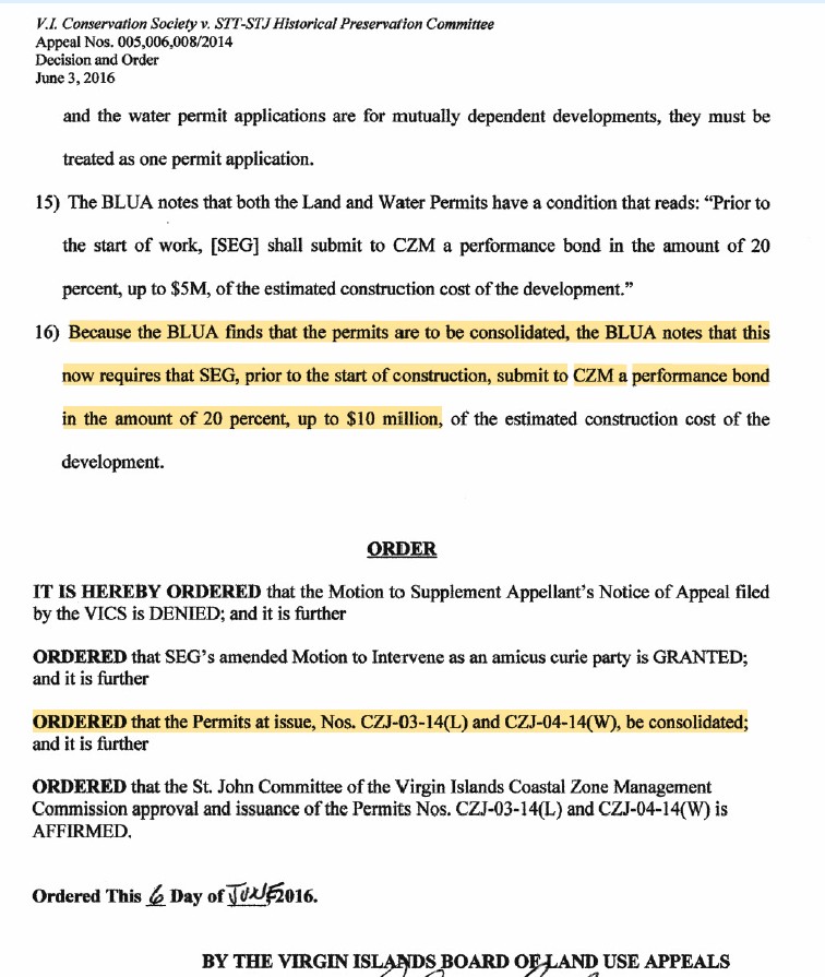 The Board of Land Use Appeals filed their written decision on XXX 2016, and it didn’t contain too many surprises. In their final order, BLUA required that the two CZM permits “be consolidated” while affirming the St John CZM Committee decision to approve the permits. This appeared to be somewhat of a contradiction – BLUA said that CZM was correct in affirming, but should have required a single “Land and Water Permit” as opposed to two individual permits. With a single permit the complete impacts of the project could be assessed, whereas in individual permits there was no consideration of “cumulative effects”.