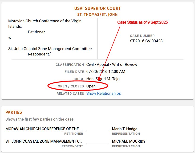 Both Save Coral Bay and the Moravian Conference felt that BLUA had erred by not considering the full scope of evidence, and continued to feel that the CZM committee had erred in not requiring comprehensive documentation of impacts. As a consequence, both parties, individually, filed lawsuits in Virgin Islands Superior Court.