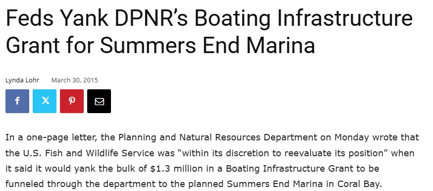 How quickly things can change. In late 2013 the Summers End Group proudly announced that they were recipients of a million dollar federal grant for construction of the Coral Bay marina. Once community members learned of this, and researched the grant conditions, we quickly saw that SEG was not eligible for the grant due to the major impacts on protected environmental resources. Within six months of the grant approval, it was rescinded by the US Fish and Wildlife Service.