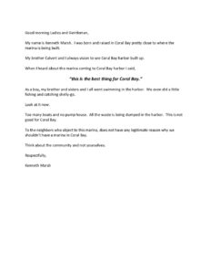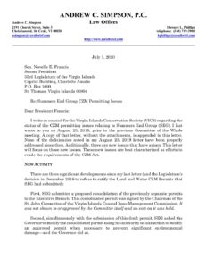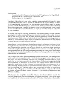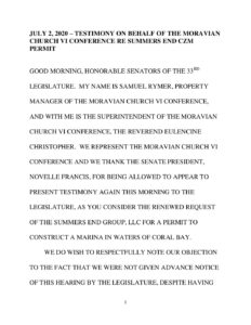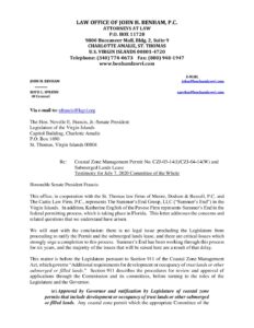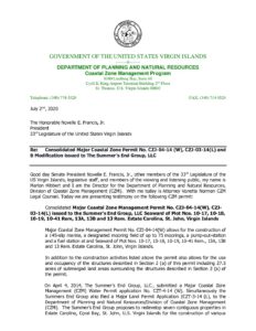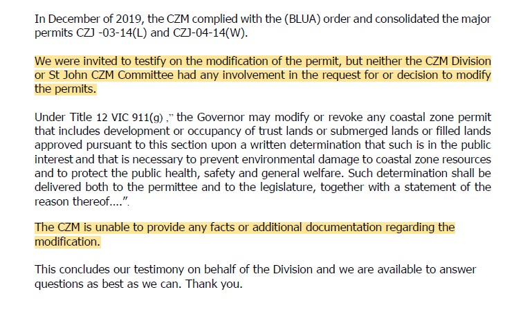 Listed below are all of the written testimonies by supporters and opponents of the Summers End project, presented during the July 2020 Committee of the Whole. Of particular note is the brief written testimony of CZM Director Marlon Hibbert. In his testimony Hibbert stated that CZM had no part in the “modifications” made to the permit by the Governor. This acknowledgment meant that the was no Coastal Consistency Determination made for those extensive project modifications. Ultimately this would mean that the “CZM Permit” was not valid for federal CZM consistency purposes. Hibbert wrote: