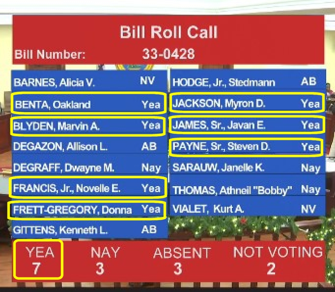 In spite of all of our letter-writing, the behind-the-scenes discussion with Senators, letters to the Governor, in the end it was the decision of Senate President Novelle Francis to bring the permit ratification before the lame duck Legislature in December 2020.  And the tally tells the story – seven in favor, 3 opposed, 2 not voting, 3 absent.