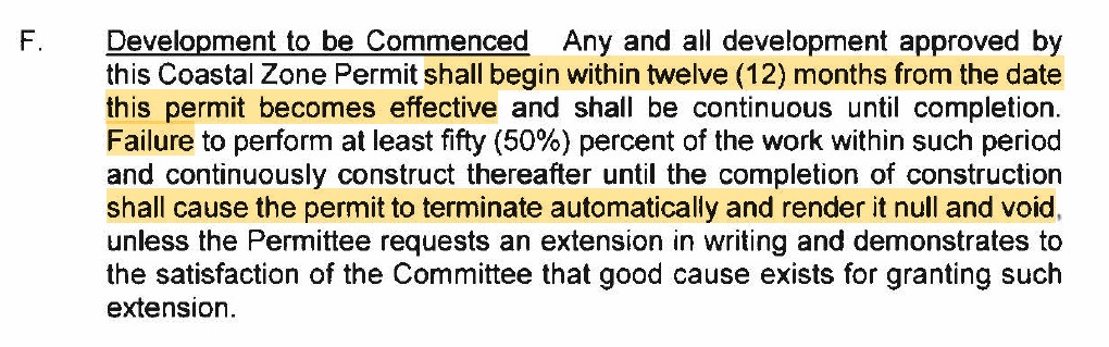 In fact, the permit did have an express provision for extension of the expiration date:  the applicant could have gone to the St John CZM Committee (prior to December 2021) and explained that they had not yet received their Army Corps permit, and requested an extension “for good cause.”  But SEG did not do that in 2021, or in 2022, or in 2023, or in 2024 and by March 2025 it was clearly too late, although Hibbert left the door open for them to try.