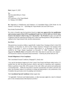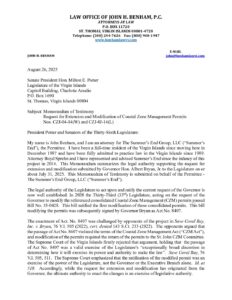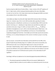 For those interested, each of the prepared testimonies sent to the Legislature in advance of the August 28, 2025, Committee of the Whole are listed below, with links to the documents. Of particular note are (a) the letter from the St John CZM Committee signed unanimously by the members of the Committee, (b) the written testimony of territorial Chairwoman of the Coastal Commission, Ms. May Adams Cornwall, (c) the written testimony of Ms. Jacquelyn Clendinen, and (d) the impromptu testimony delivered by me which was actually the text of an email I had sent the day before to all Senators.