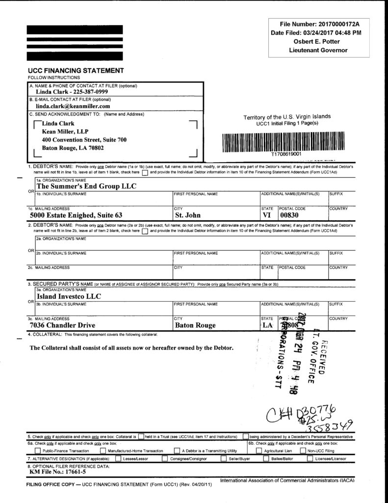 Based on public filings in the SEG-Phillips lawsuit we know that sometime in early 2017, SEG borrowed a significant sum of money from an entity known as “Island Investco” based in Baton Rouge, La. Given the timing, it seems that this money was likely used, in part, to prepare the extensive resubmission of project documents made by Summers End in August 2017, immediately prior to Hurricane Irma. A Uniform Comercial Code (UCC) filing in March 2017 states that “The Collateral shall consist of all assets now or hereafter owned by the Debtor.” The Debtor is The Summers End Group LLC. The Secured Party is “Island Investco LLC.”