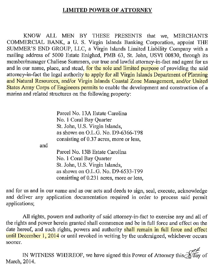 By December 1, 2014, when the Limited Power of Attorney automatically expired, the Summers End Group had made no real progress in permitting, since the Legislature refused to ratify and the BLUA appeals had stayed the CZM permits, and an Army Corps permit had not been fully submitted and accepted by the Corps.  This would not be the last time that the Summers End Group allowed a key legal document to automatically expire.