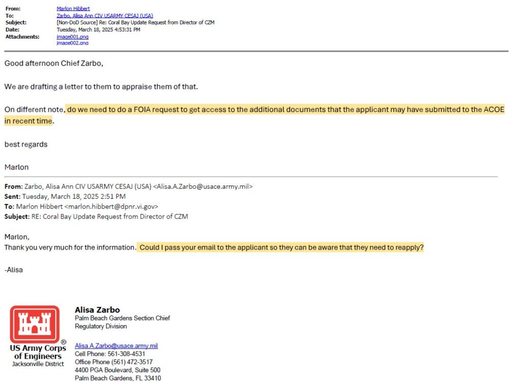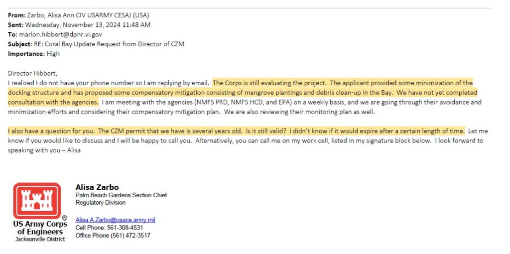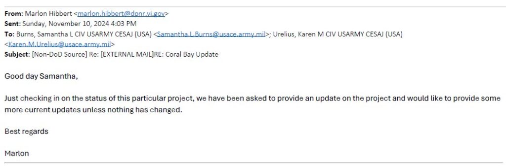 However, as a result of the invitation to testimony, CZM Director Marlon Hibbert apparently felt that he should ask the Army Corps what the current status of the project was. He clearly was not “in the loop” and didn’t know who the reviewer was, but he sent this email to Ms. Samantha Burns (the prior reviewer) on November 10, 2024: