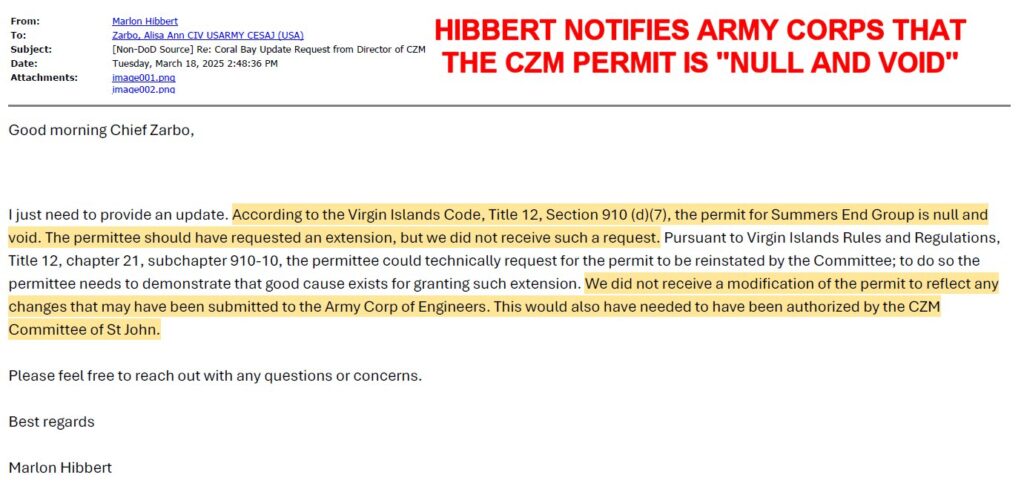 Coincidentally, in late 2024, the Committee on Economic Development of the Virgin Islands Legislature was also interested in knowing what was happening with Summers End, given that the CZM permit had been ratified four years earlier. They called for a hearing in early November, invited SEG, DPNR and Clendinen family members to testify. Notably they did NOT invite Save Coral Bay or the St John CZM Committee.