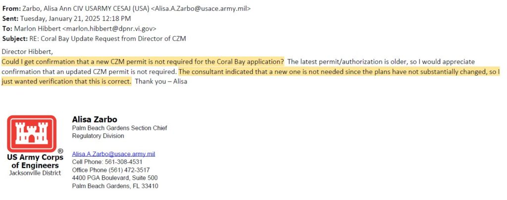 Apparently CZM Director Hibbert did not respond to the November request regarding CZM permit validity from the Army Corps. And DPNR/CZM did not testify before November hearing with the Legislature Committee on Economic Development. On January 21, 2025,Ms. Zarbo sent a follow-up inquiry on the permit status to Hibbert: