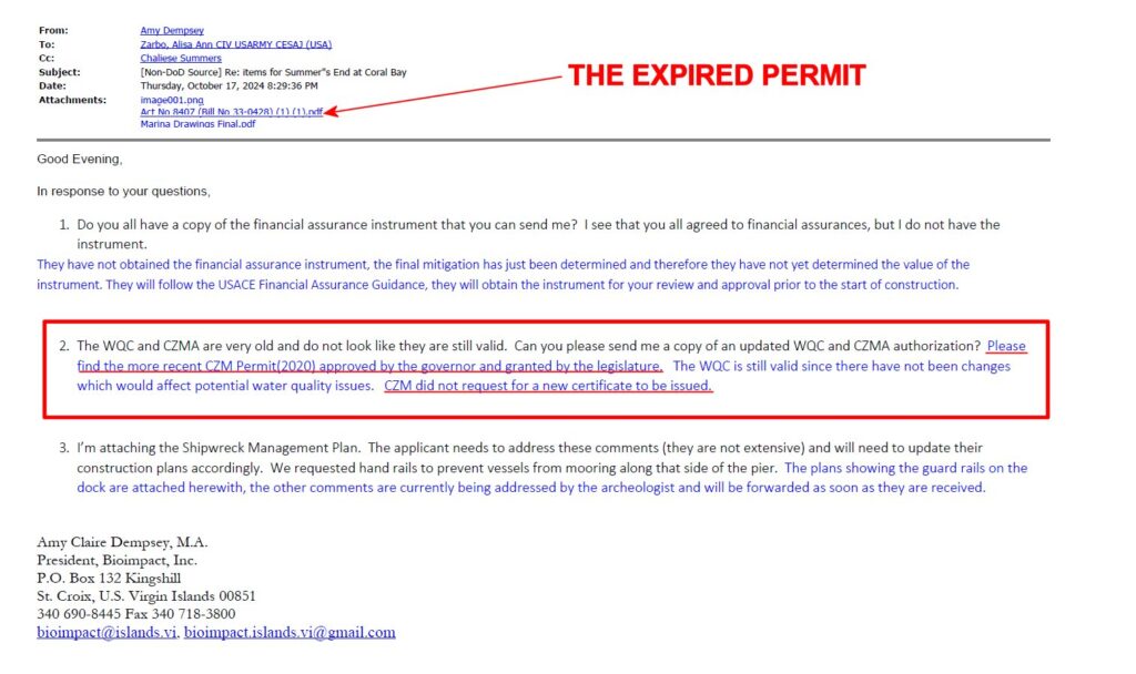 On October 17, 2024, Ms. Zarbo sent an email to the Summers End consultant, Amy Dempsey, inquiring on the status of territorial approvals. Ms. Zarbo wrote: “The Water Quality Certificate and Coastal Zone Management Permit are very old and do not look like they are still valid. Can you please send me a copy of an updated WQC and CZM authorization?”
